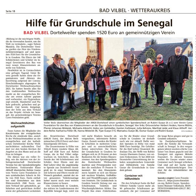 Kurz nach der Gründung der Foundation erhielten wir von der ARGE Dortelweiler Vereine den gesamten Erlös des von ihnen initiierten (Corona-) Weihnachtsmarktes 2021 in Höhe von 1.520,00 Euro (siehe dazu Wetterauer Zeitung, 22.02.2022).